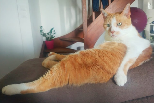 En plein montage de mon nouvel arbre à chat pendant que l'imberbe se la coule douce. Je lui ai pourtant déjà dit que la sieste appartient à ceux qui s'y mettent tôt !